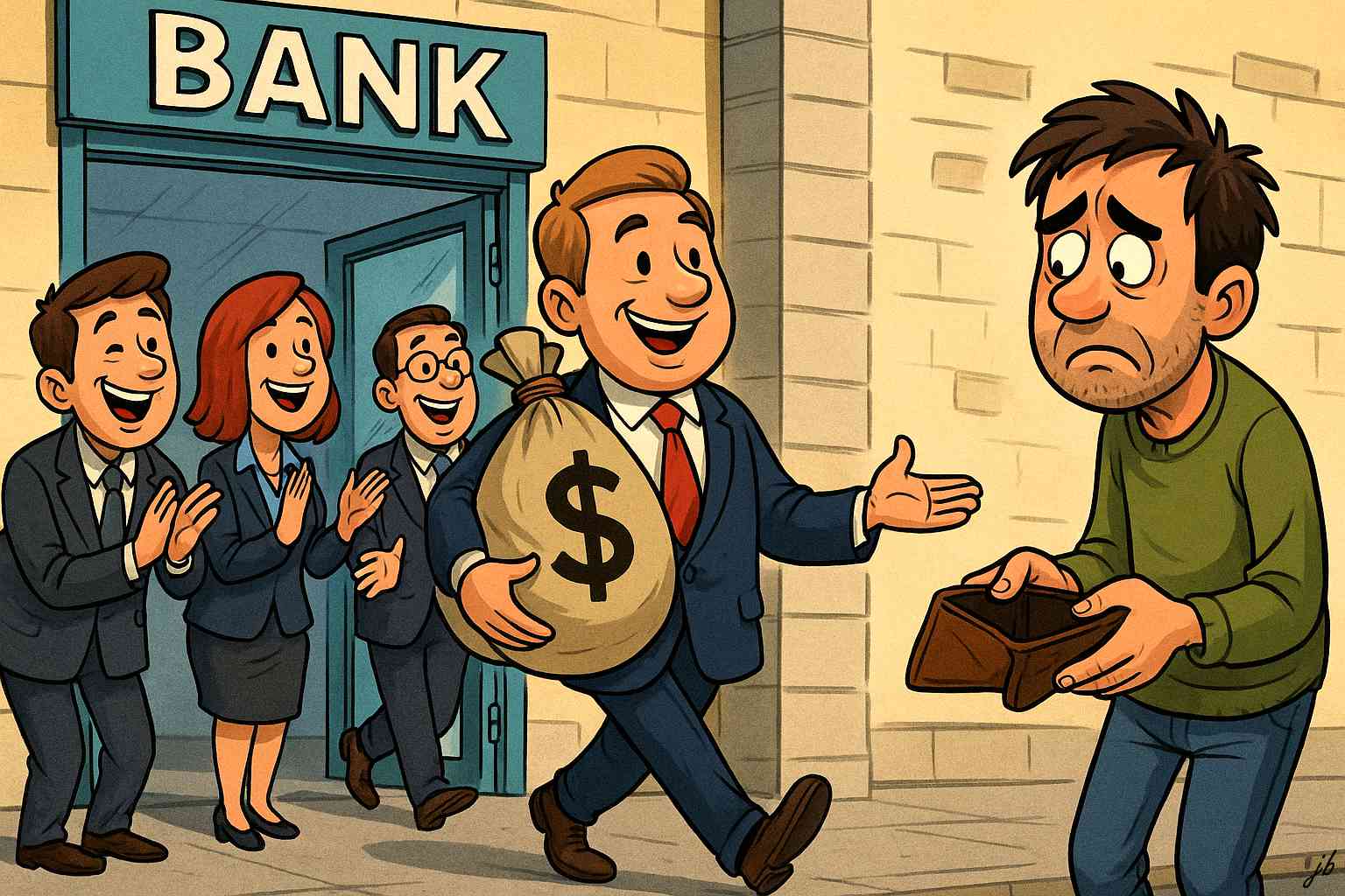 Rozdíl mezi bankovním boháčem a obyčejným člověkem je tedy obrovský. Banka chce peníze teď hned, člověk chce klid na život. A zatímco banky počítají nuly na účtech, lidé počítají dny do další výplaty.