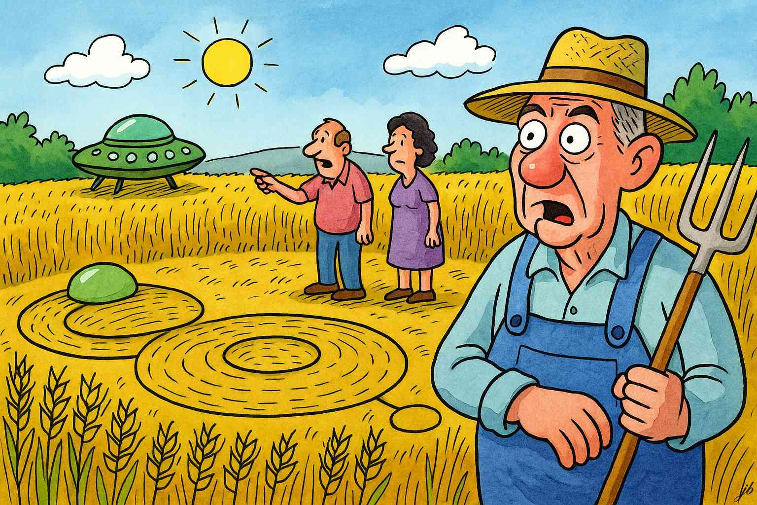 Život na venkově má své rutiny – ranní káva, zvonění kostelních hodin, a občas i kromě rybáře na rybníku — záhadné obrazce v obilí, které vypadají jako z vesmíru. Někdo vidí geometrické obrazy, jiný podivné světelné kruhy. A vesničané? Ti si v tom najdou nové téma. Kruh, který se objeví přes noc, je jako automat na bulvární titulky: vzbudí emoce, strach i údiv – a hlavně spoustu keců u plotny.