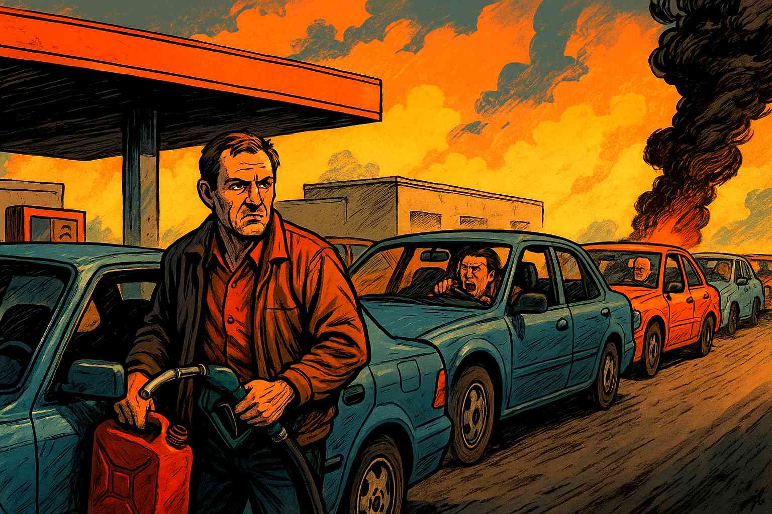Záběry z čerpacích stanic připomínají postapokalyptický film – jen místo zombíků se vlečou znudění řidiči s kanystrem a cigaretou v koutku. Sociální sítě zaplavily videa nekonečných kolon, kde se lidé hádají, kdo si pumpu „rezervoval“ jako první.