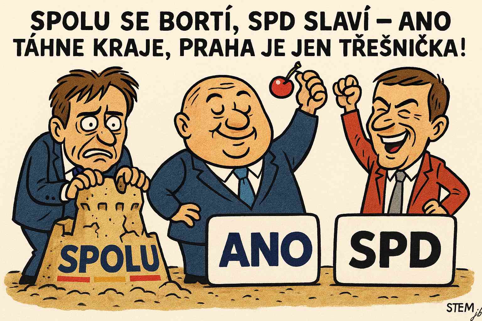 Koalice Spolu (ODS, TOP 09, KDU-ČSL) se drží už jen v Praze – tam, kde se nosí latte, ironie a víra v pravicové ideály. Zbytek republiky? Ten už si balí kufry pod křídla ANO, které by podle STEMu vyhrálo i volby na Marsu. SPD se mezitím plíží jako stín za Spolu – v krajích, kde kdysi vládly tradiční strany, dnes vládne nostalgie a Tomio.